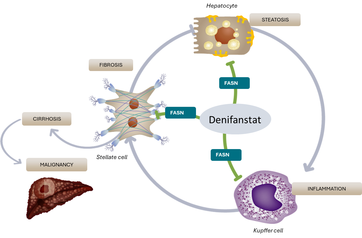 In MASH, this promotes excess accumulation of fat in the liver, which can damage the liver and stimulate inflammation and fibrotic scarring, thus targeting FASN overactivity may provide the opportunity to simultaneously tackle several components of disease.